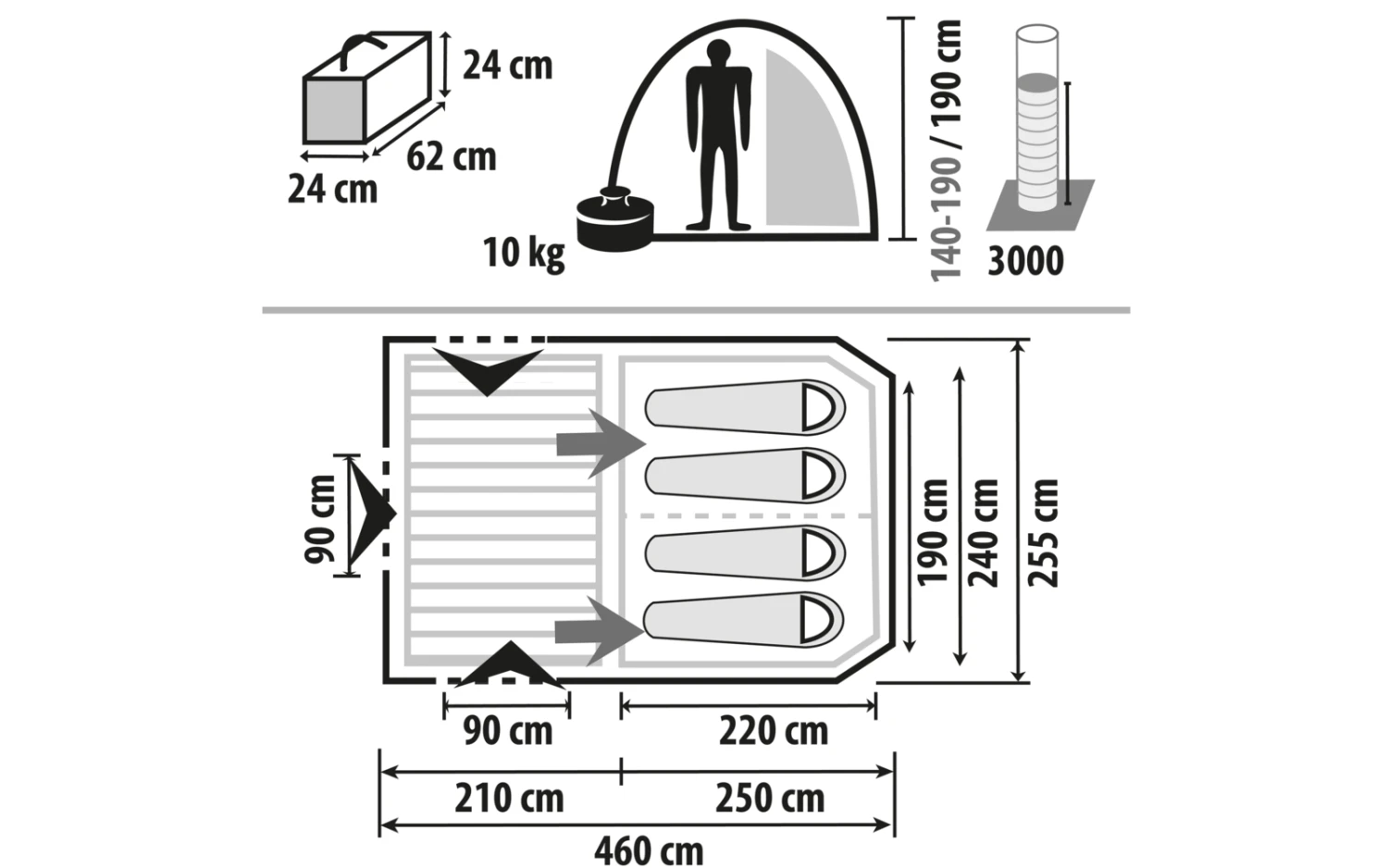 | Zelthöhe | 140 – 190 cm |