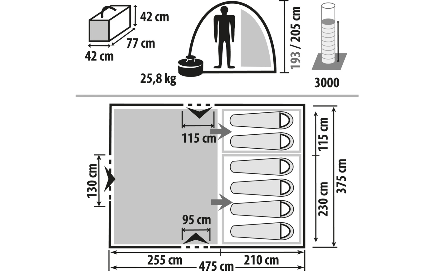 | Zelthöhe bis | 205 cm |
